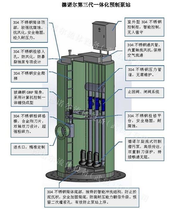 型號(hào):DNRP - 一體化泵站的筒體部和底部均采用的304不銹鋼制造而成,使其有了較強(qiáng)的抗腐蝕、抗風(fēng)化能力,同時(shí)部和底部的內(nèi)部支撐設(shè)計(jì)也讓其更加安全穩(wěn)固和經(jīng)久耐用。